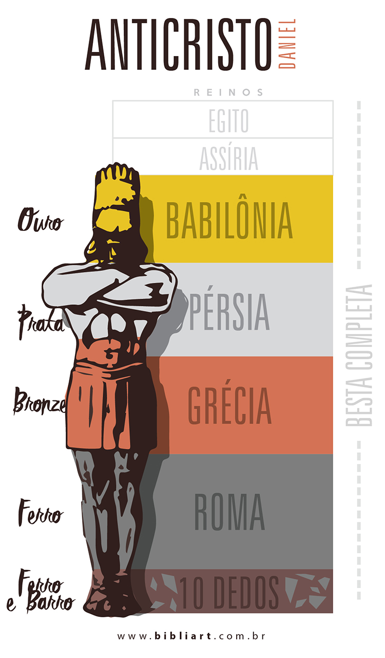 Essa sequência de impérios apresentada no sonho de Nabucodonosor é essencial para compreendermos as profecias do Apocalipse. Abaixo uma representação da estátua bem como os reinos que cada parte da estátua se refere.
