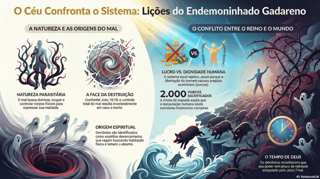 O relato do endemoninhado gadareno (ou geraseno), registrado em Marcos 5:1-20, vai muito além de um simples exorcismo. É uma confrontação territorial, econômica e espiritual.